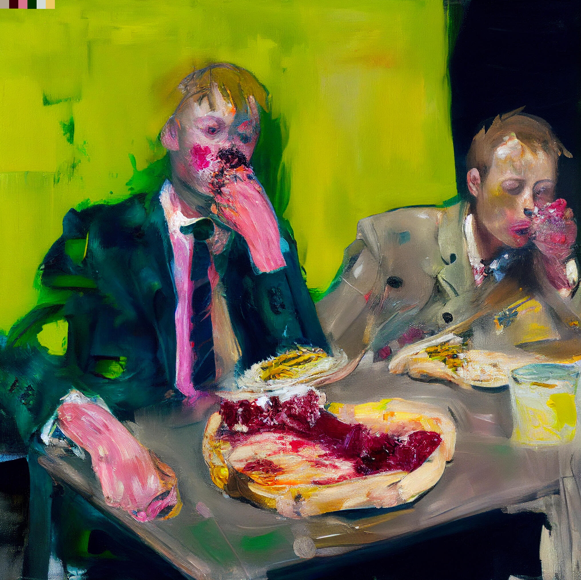 After a wild afternoon of drinking, Jake and Jimmy find themselves completely drunk and lost. They wander around the city, not sure where they are or what they're doing. They stumble upon a nice pizzeria and decide to go inside to get some food.Once inside, they sit down at a table and start to slur their words as they try to order some food. The employees are confused by their behavior and don't know how to handle them. Jake and Jimmy continue to drink and laugh loudly, disturbing the other customers.As their meal goes on, they become increasingly impolite and disruptive. They start to knock over chairs and tables, causing a scene in the restaurant. The manager calls the police to come and take them away.The next morning, they will wake up in a jail cell, remembering not at all what happened the night before. They are confused and embarrassed, and they vow to never get so drunk again. But deep down, they know that this is just the latest in a long string of crazy and reckless nights for them.