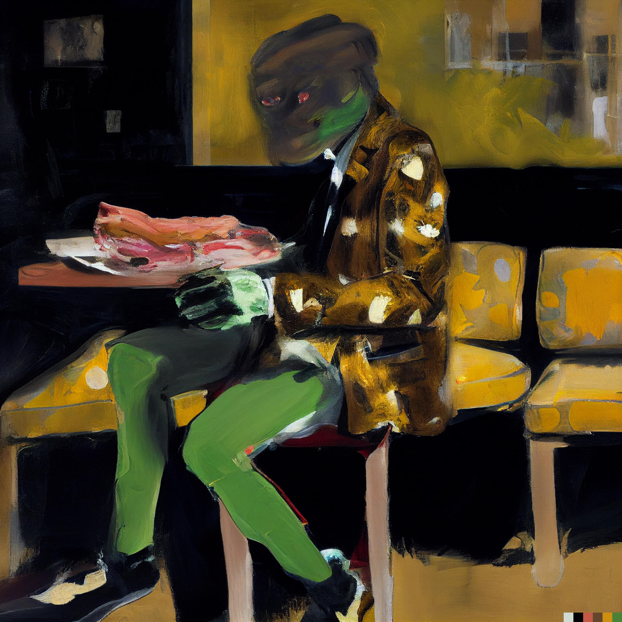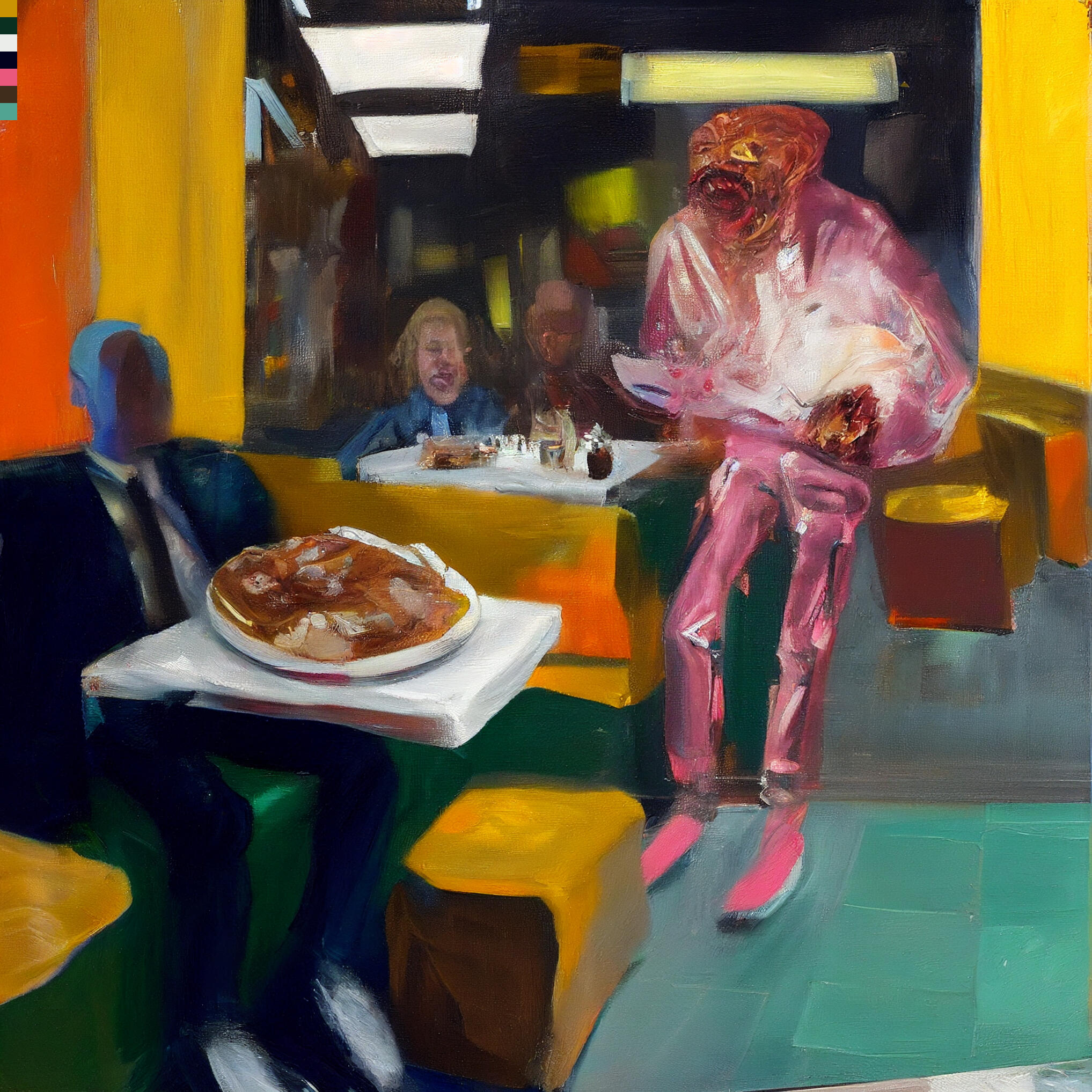 Meanwhile, the monster waiter continues to serve things to other guests while lurking to them, ogling with a strange, knowing smile.The lurker kept lurking and they started to realize that the waiter is not just a monster, but a supernatural creature of some kind. They are both terrified and fascinated, unsure of what to do. Eventually, the manager now finally calls the police.The waiter who comes now to reconcile looks like a monster with no skin and sharp teeth. Jake and Jimmy are shocked, but they are too wasted to react. The other guests are horrified and confused by Jake and Jimmy's behavior.The situation becomes even more absurd when Jimmy stands up and tells the monster waiter to "calm down" or he will "slap his gold chain on his ass". The guests are stunned any nobody knows exactly how to react anymore.