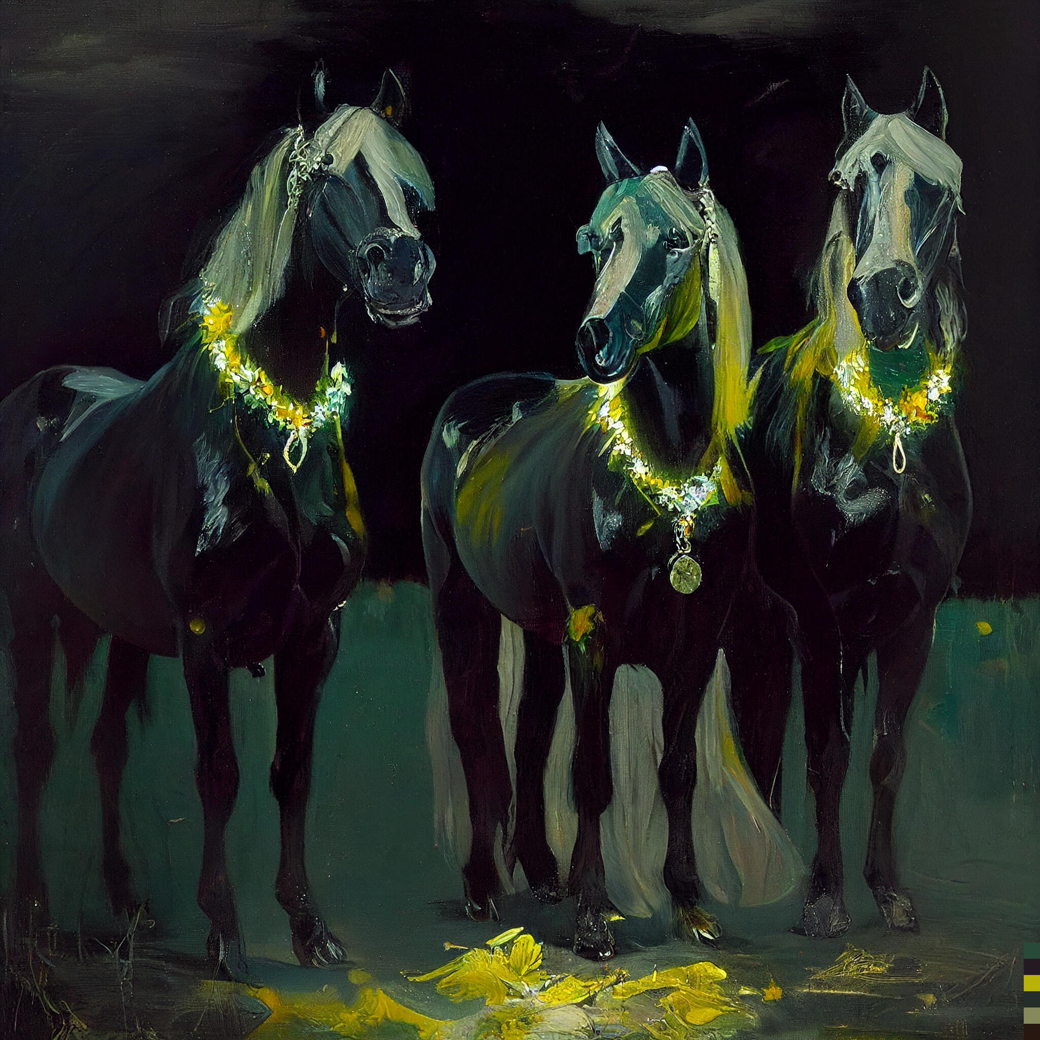 Their adventure wasn't over yet. They still had to get a horse for their friend Jimmy, who had been eager to join in on the fun. So, the next day, Jake and Zoe set out to find a third horse for Jimmy.They searched high and low, but it wasn't until they came across a small, run-down farm that they finally found the perfect horse. Jimmy was overjoyed when Jake and Zoe presented him with the horse. He named it Rusty.But Jake and Zoe weren't done surprising Jimmy yet. Along with the horse, they also presented him with a set of gold chains for all three horses. Jimmy was shocked by the gift and couldn't believe his eyes. The chains were beautifully crafted and sparkled in the moonlight. But as he looked closer, he realized that the chains weren't made of gold at all – they were covered in thousands of yellowish diamonds.The horses were delighted with their new bling, and they pranced around proudly, showing off their dazzling necklaces to anyone who would look. Jake, Zoe, and Jimmy were the happiest they had ever been. They rode their horses through fields and forests, feeling free and wild. And with the new diamonds shining brightly around their horses necks, they knew that nothing could stop them now.This was truly an extra ordinary day.